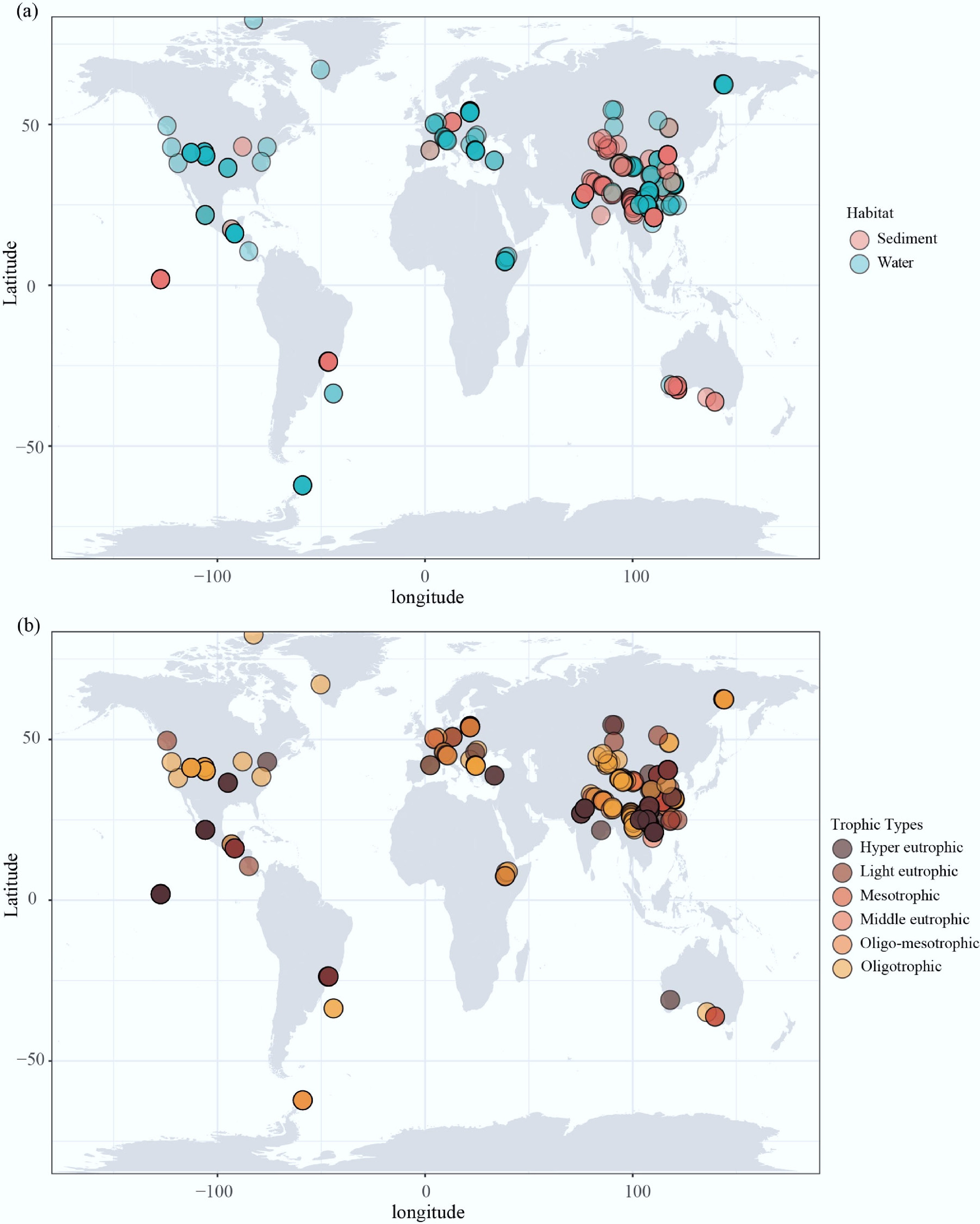 Global distribution map of 379 selected lakes reservoirs. Global map showing locations, (a) sample types, and (b) trophic types of 379 lakes and reservoirs studied here.