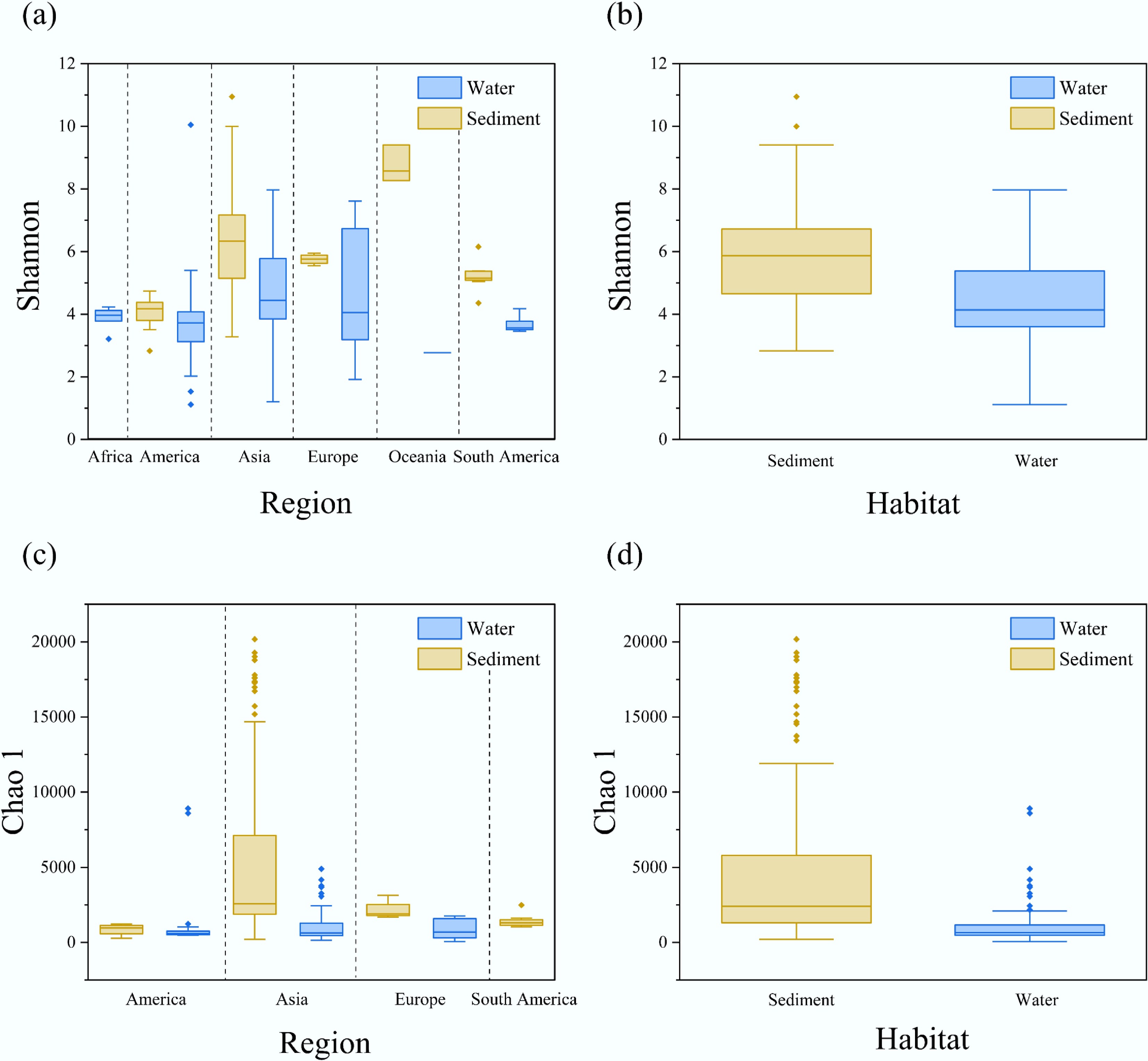 • From the perspective of different habitats, Fig. 2a illustrates the distribution of Shannon indices in water (blue), and sediment (brown) samples across various regions. It is evident that sediment samples generally exhibit higher Shannon indices than water samples, indicating a relatively higher microbial diversity in sediments. Moreover, the variation in Shannon indices is more pronounced in sediment samples, reflecting greater heterogeneity in microbial communities. These observations are statistically supported: independent samples t-tests confirmed significant differences in both Shannon and Chao 1 indices between sediment and water samples (p < 0.05), suggesting a consistent pattern of higher bacterial diversity in sediments.