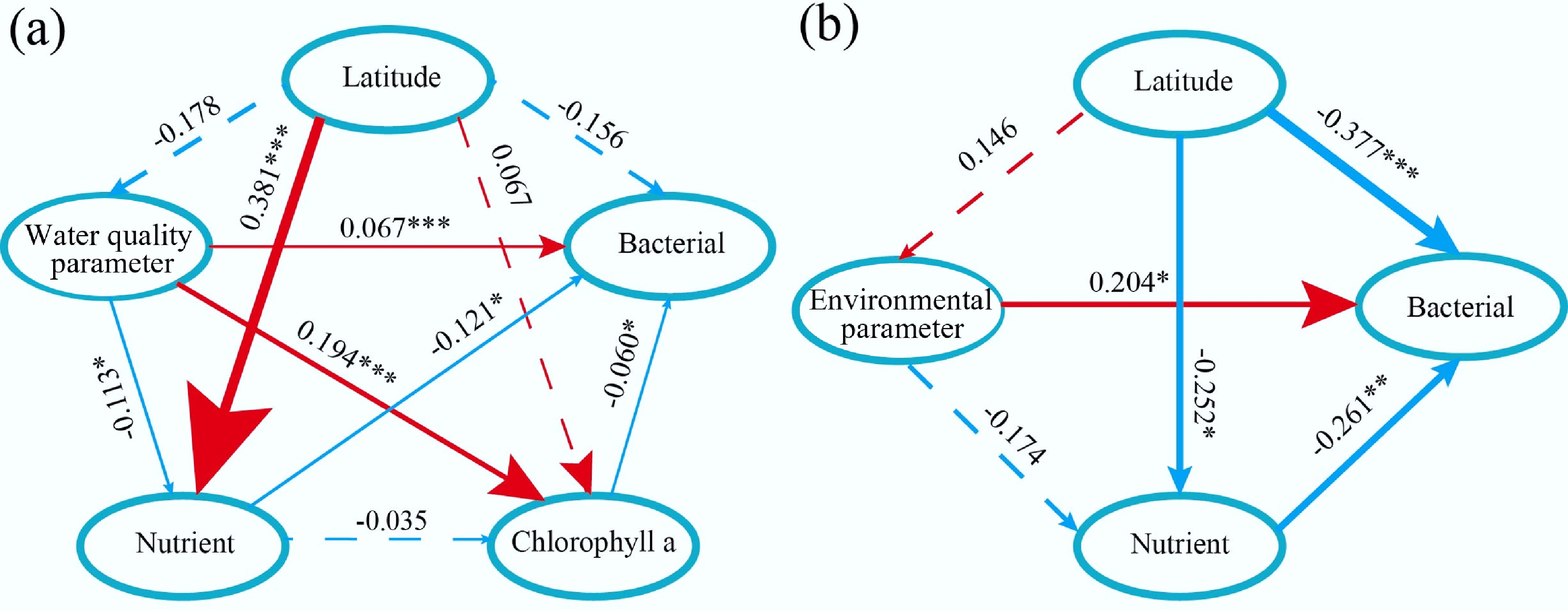 Controlling factors of different bacterial communities. Partial least squares-path models illustrate the effects of different factors on bacterial diversity variation in (a) water, and (b) sediment. Red lines indicate positive effects, and blue lines indicate negative effects. Significance level, * p < 0.05, ** p < 0.01, *** p < 0.001.