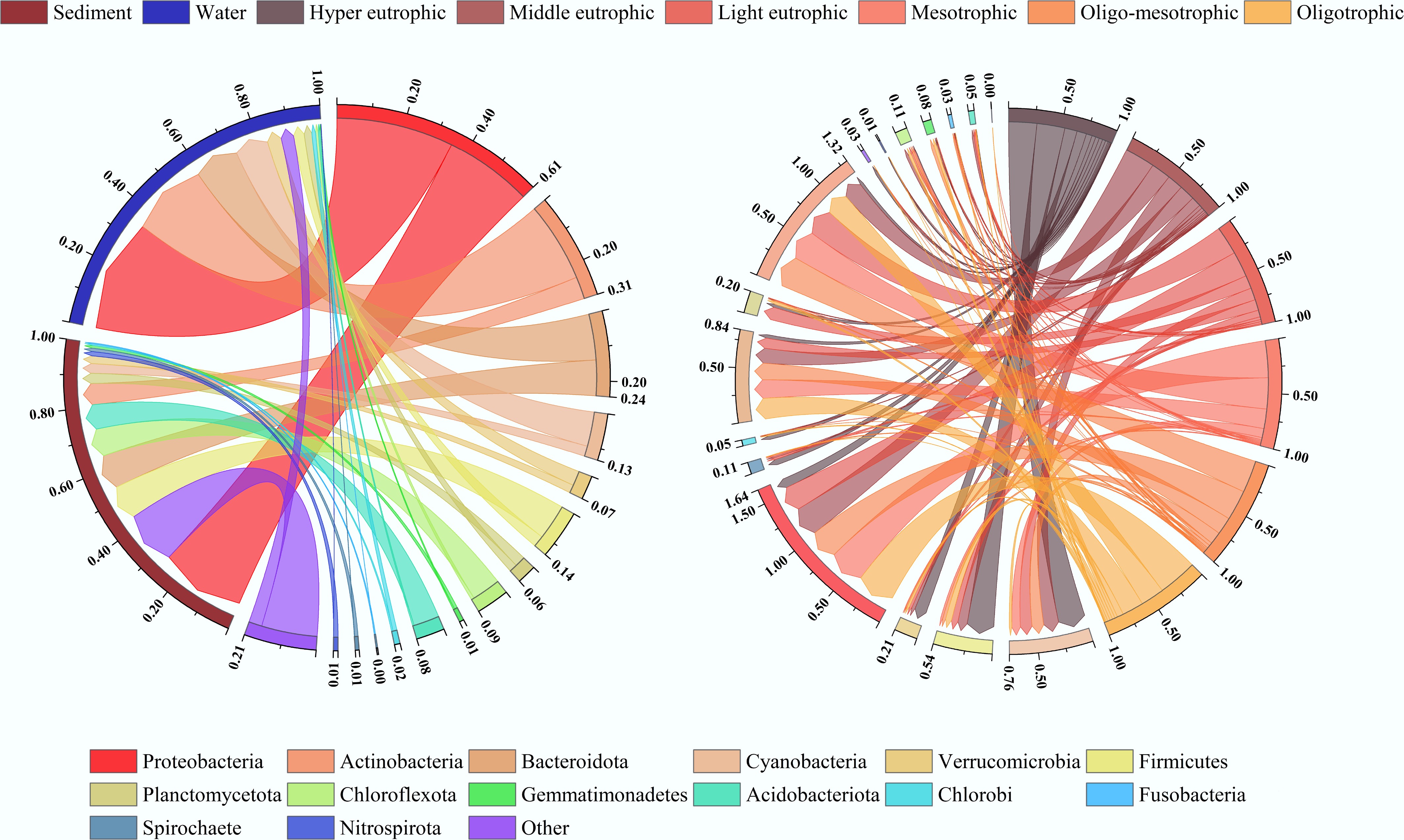 In aquatic habitats, Actinobacteria (15.3%) and Cyanobacteria (6.7%) exhibit relatively high abundances, consistent with earlier studies by Yang et al.[47], which reported that these phyla thrive under conditions with sufficient light and nutrients. Figure 4b further illustrates that while Proteobacteria dominate across multiple trophic categories, Cyanobacteria and Actinobacteria are more prevalent in eutrophic states, reinforcing the observation by Wang et al. that the ability of Cyanobacteria to fix nitrogen and utilize high nutrient loads gives them a competitive advantage in nutrient-rich waters[46].