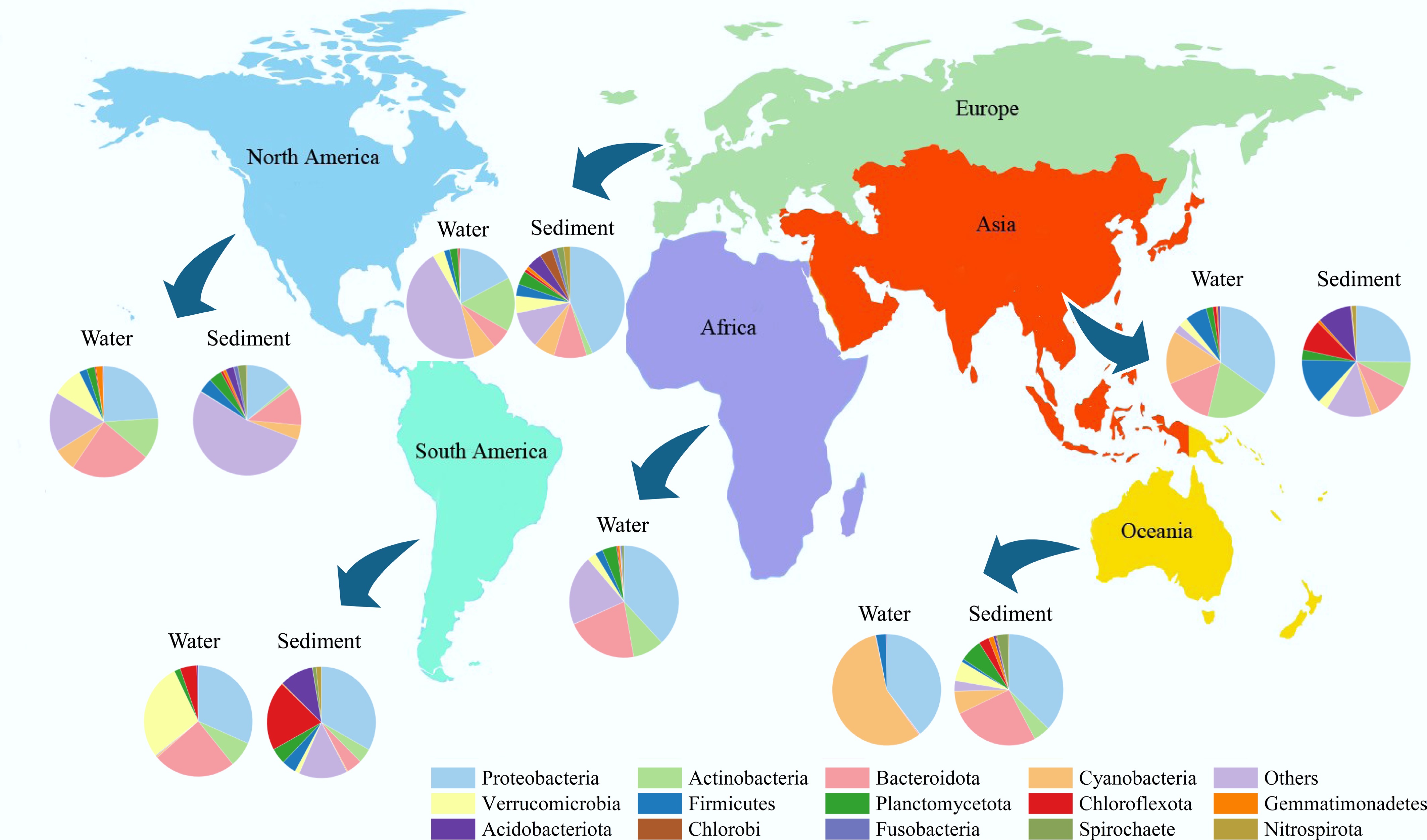 In addition, Fig. 5 shows that bacterial community structures across water and sediment samples vary substantially across continents, indicating notable spatial heterogeneity. This finding suggests that, beyond local trophic conditions, broader-scale geographic and environmental factors shape bacterial community composition. Such patterns align with the broader understanding that bacterial biogeography is driven by a complex interplay of nutrient availability, hydrological conditions, and regional environmental variability[4547].