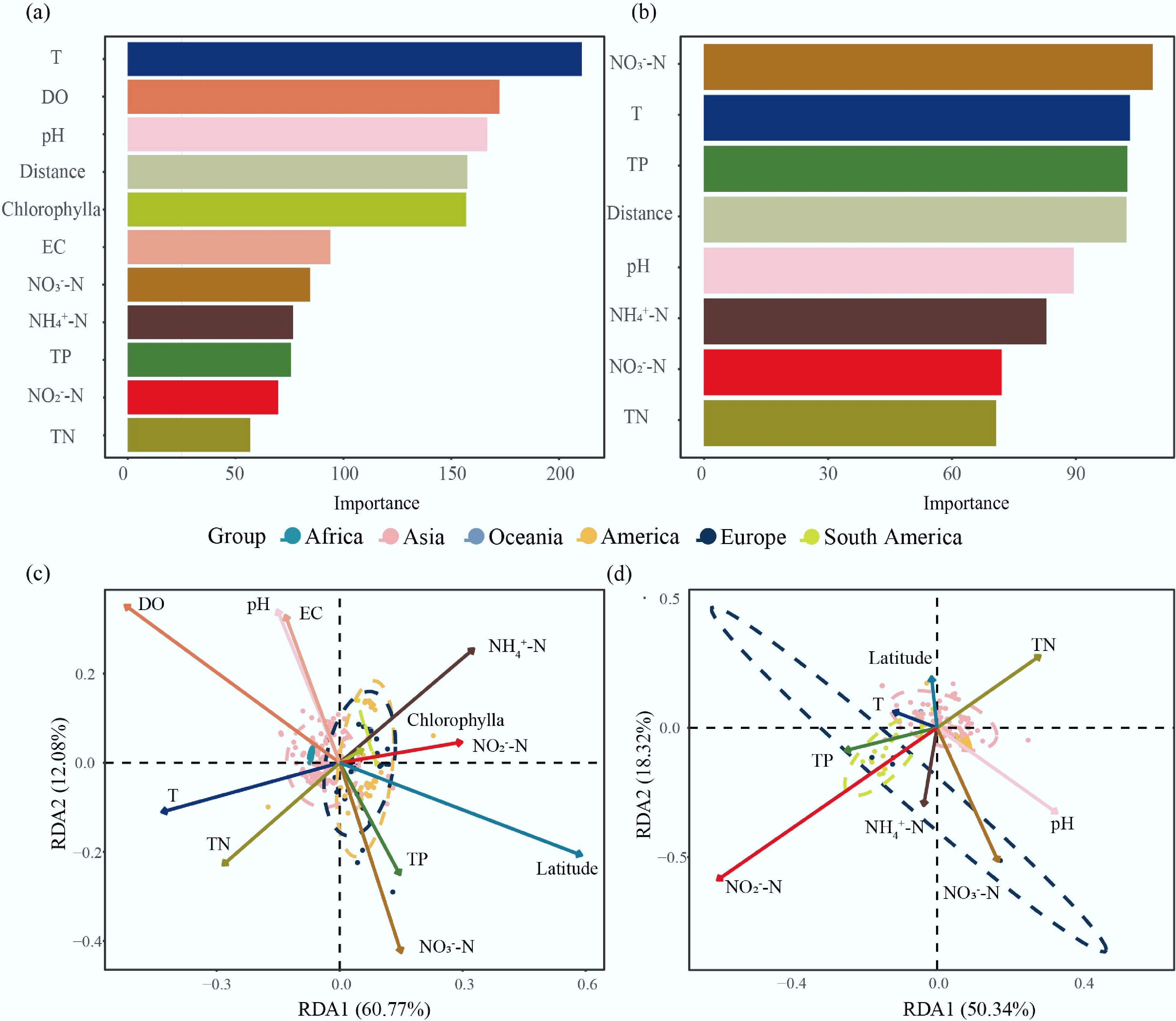 RDA results presented in Fig. 6c show that the bacterial community structure in water is significantly influenced by environmental factors. The first and second axes of the RDA explain a total of 72.85% of the variation (with RDA1 explaining 60.77% and RDA2 explaining 12.08%). Key environmental drivers of the bacterial community structure in water include DO and latitude. Electrical conductivity (EC) and pH show a strong positive correlation. Although sampling points from different continents exhibit some clustering, overlaps are still observed between regions.