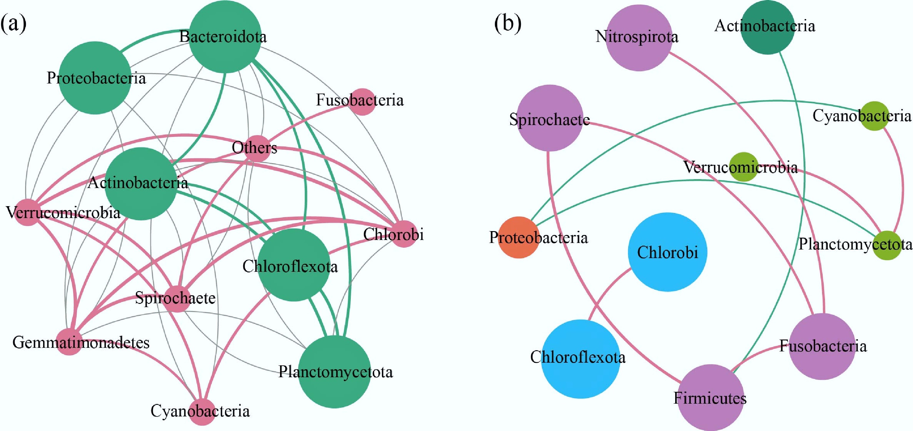 Bacterial co-occurrence network. (a) Water and (b) sediment bacterial networks across lakes and reservoirs. The thickness of the line is directly proportional to the correlation coefficient.