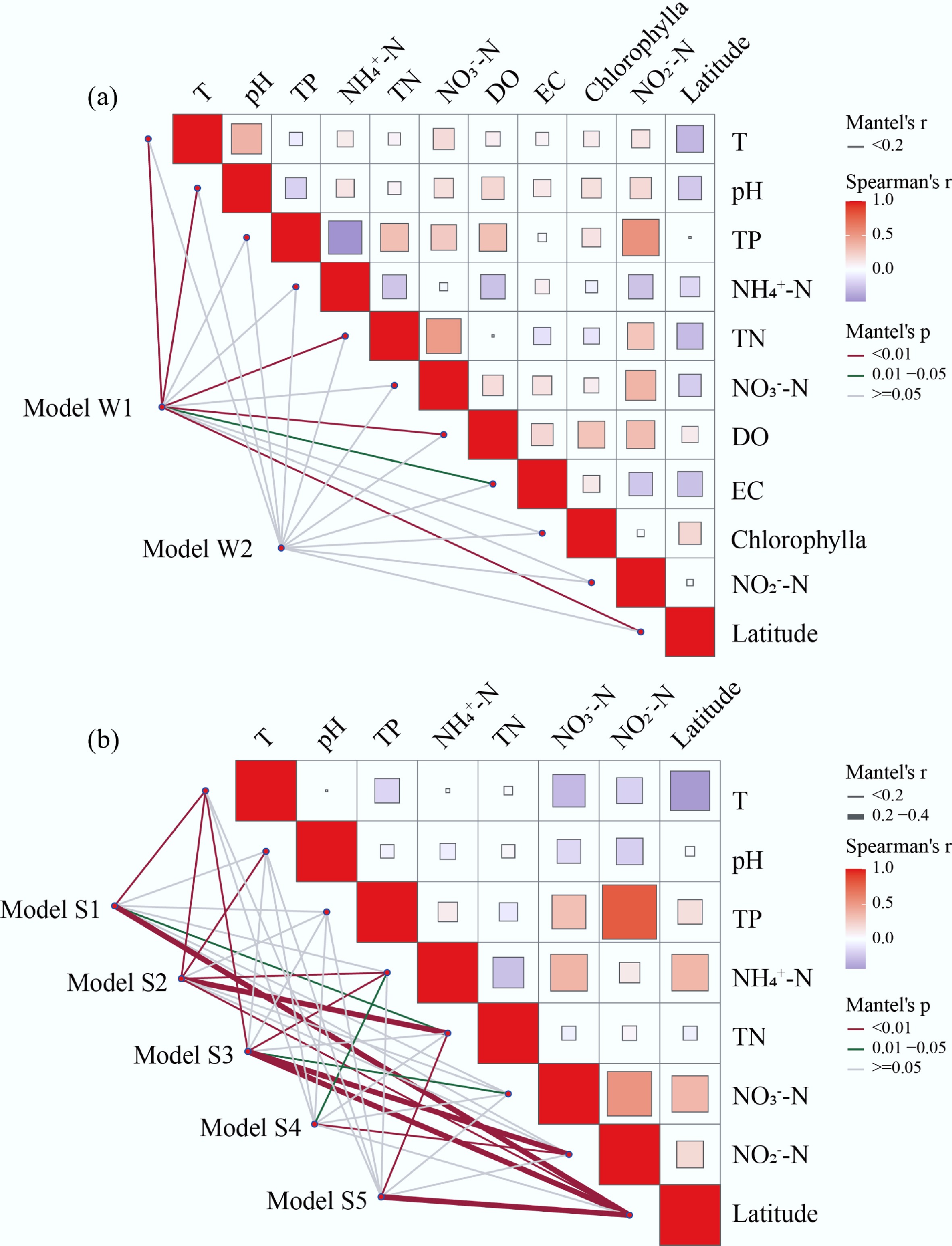 Relationships between environmental variables and ecological networks within lakes reservoirs worldwide. Pairwise correlations of the variables are shown with a color gradient denoting Spearman's correlation coefficient. Spatial variables include latitude. Environmental variables include T, pH, DO, EC. Nutrient variables include TP, NH4+-N, TN, NO3-N, NO2-N. Biological variables include chlorophylla. The red lines represent significant correlations (p < 0.01) between bacterial community structures and environmental, spatial, biological, or nutrient variables, while the green lines indicate moderate correlations (0.01 ≤ p < 0.05), and the gray lines denote non-significant correlations (p ≥ 0.05) based on the Mantel test.